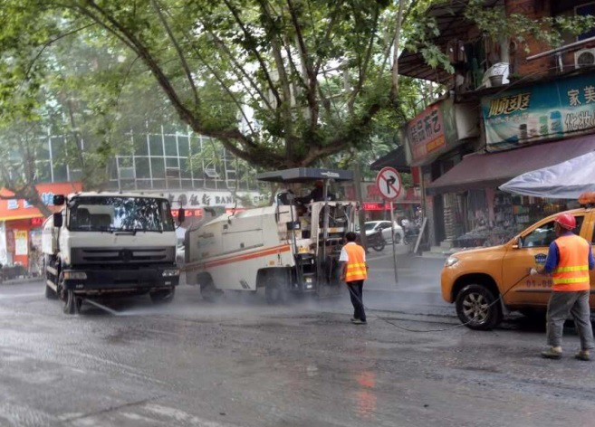 圖為市人醫(yī)十字路口銑刨機(jī)與灑水車(chē)防塵作業(yè)