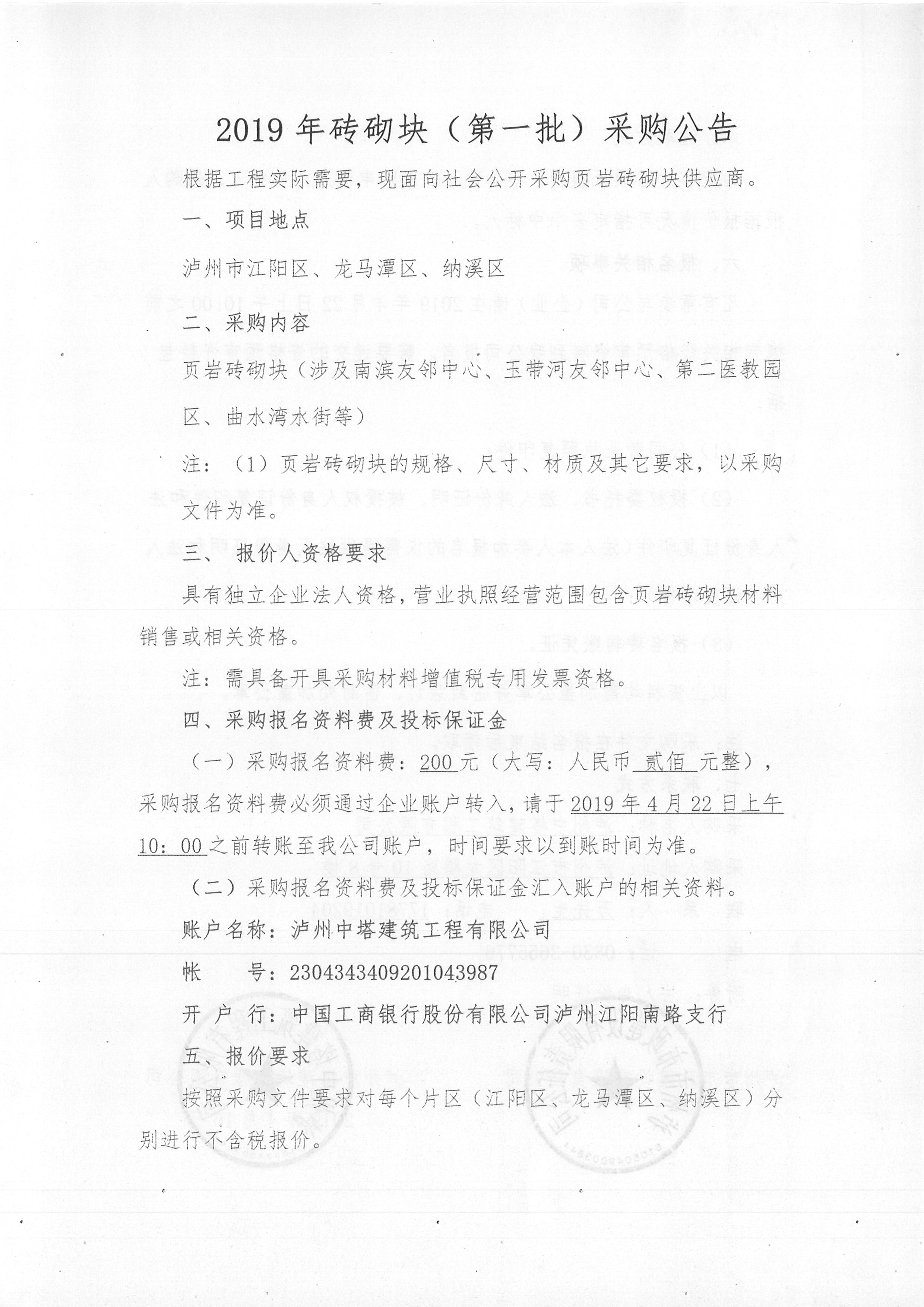 2019年磚砌塊(第一批)采購公告